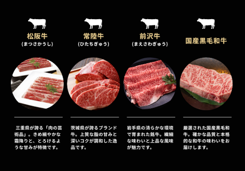 とろける松阪、香る前沢、旨み深い常陸、日本が誇る国産黒毛和牛。厳選された4銘柄の極上和牛からお好みの銘柄をお選びいただけます。